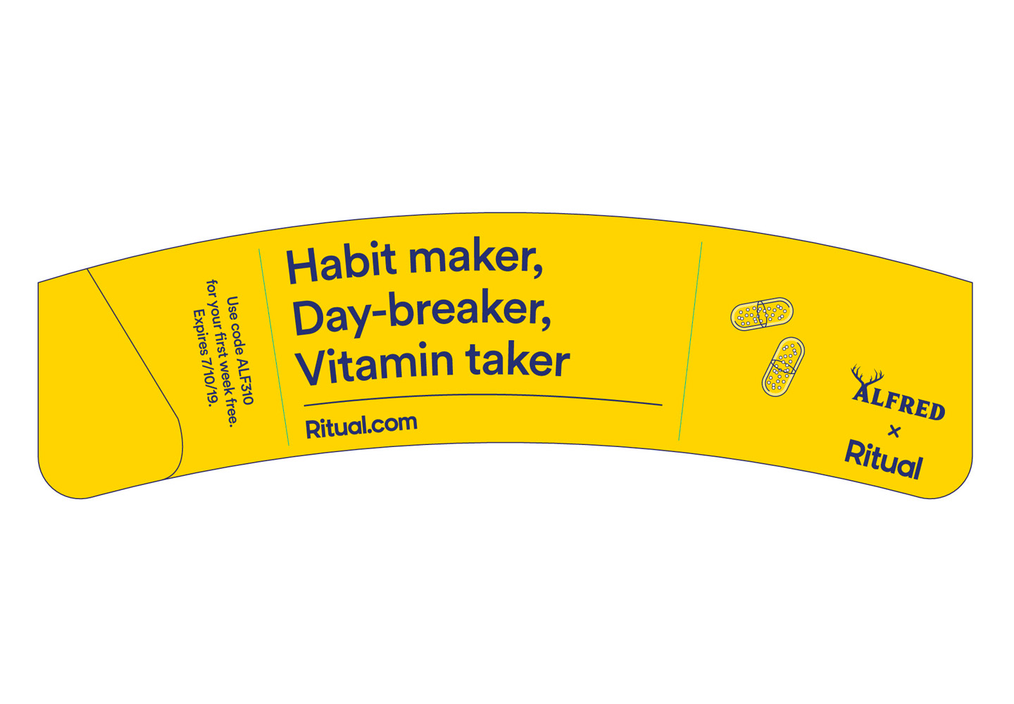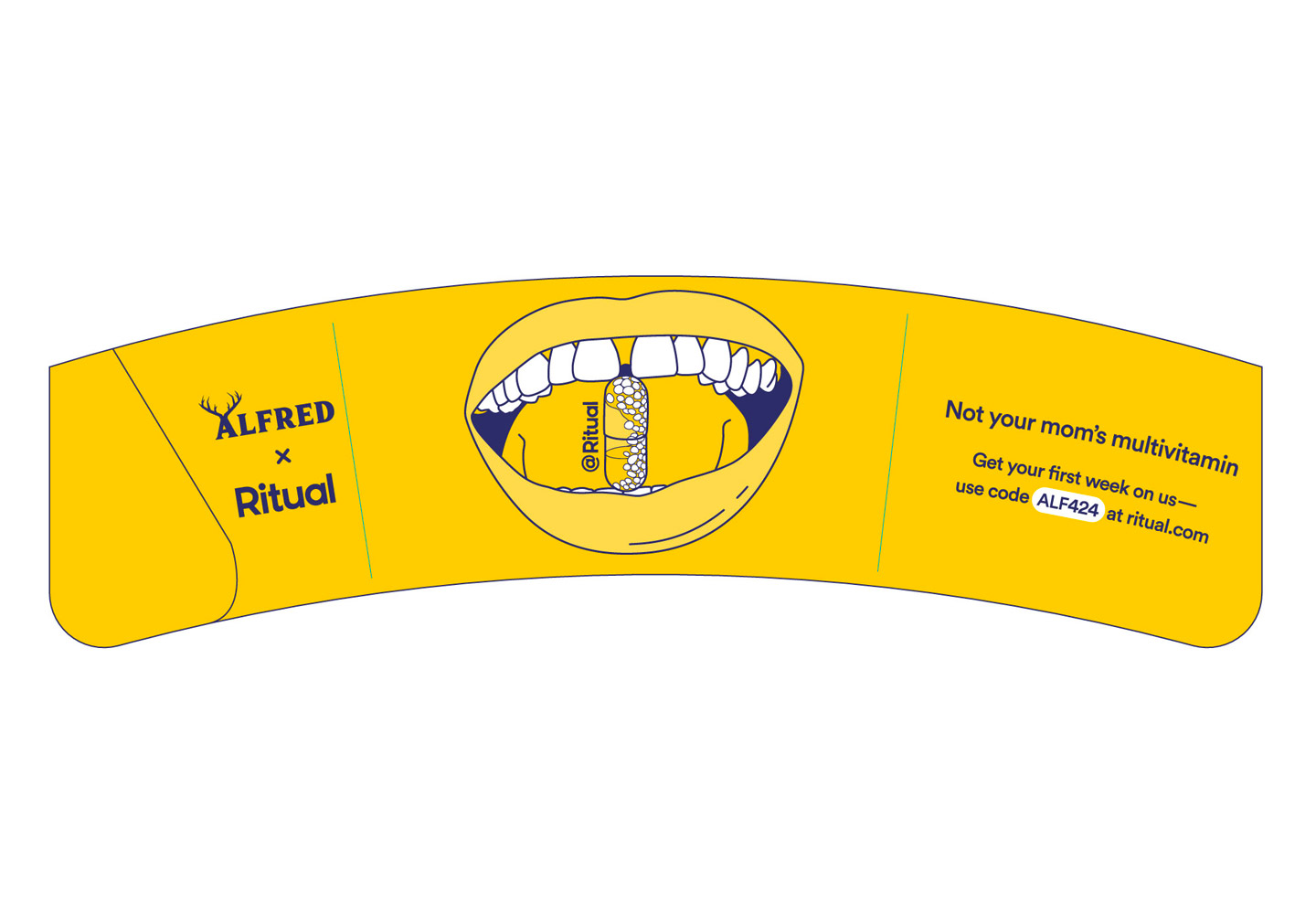Ritual had the exciting opportunity to partner with Alfred Coffee—a trendy coffee shop franchise in Los Angeles—to not only promote our brand through their coffee sleeves but also sell Ritual vitamins at several of their in-store locations.